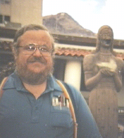1992. Left to right: yours truly; The Desert Maiden. The old Workman Center and M Mountain (Socorro Peak) appear in the background. Workman Center has been demolished and rebuilt since this picture was taken. The statue was in storage for many years, but was reinstalled in front of the new Workman Center on February 15, 2008.